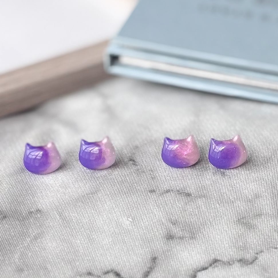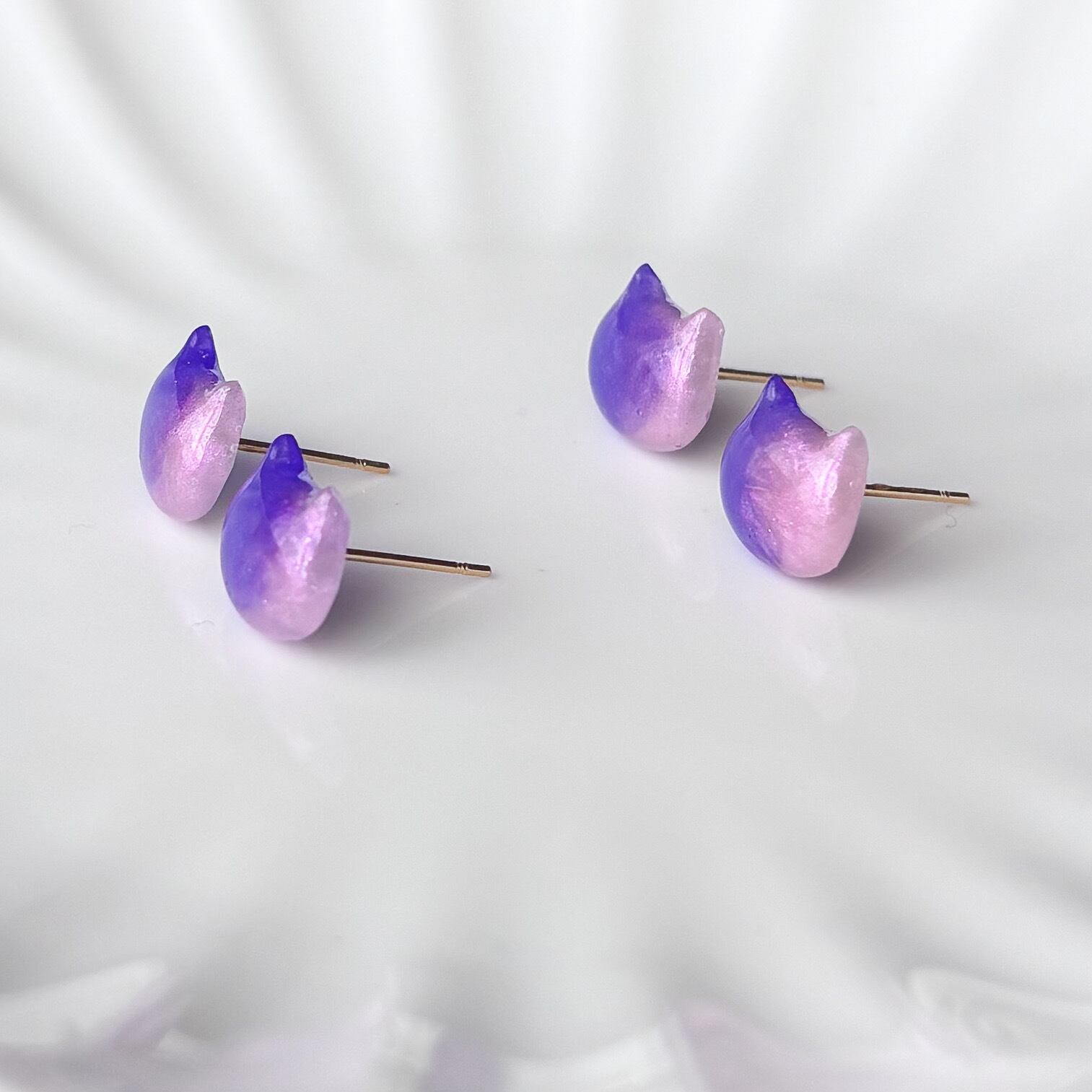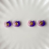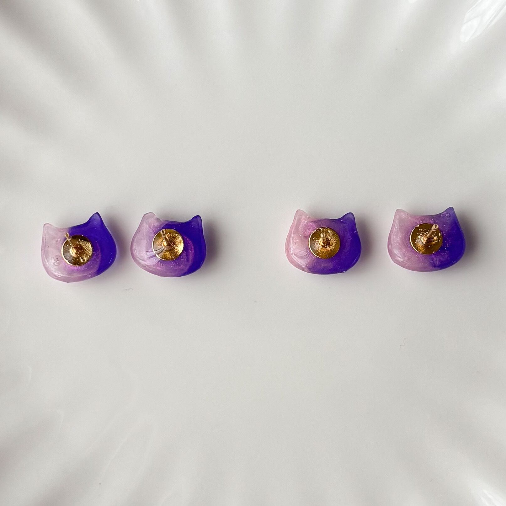 やさしいパープルとピンクのグラデーションが可愛い、ネコモチーフのピアス。