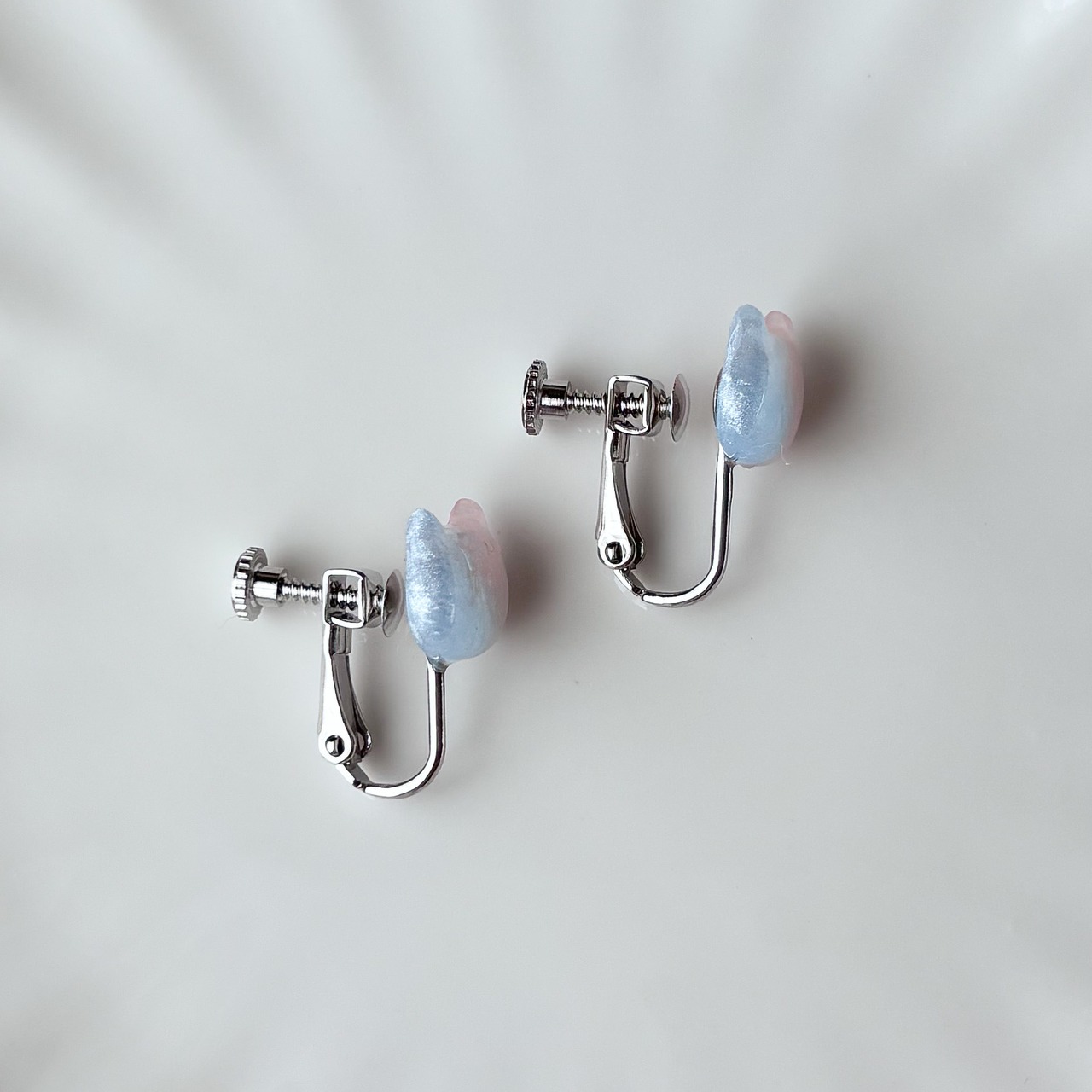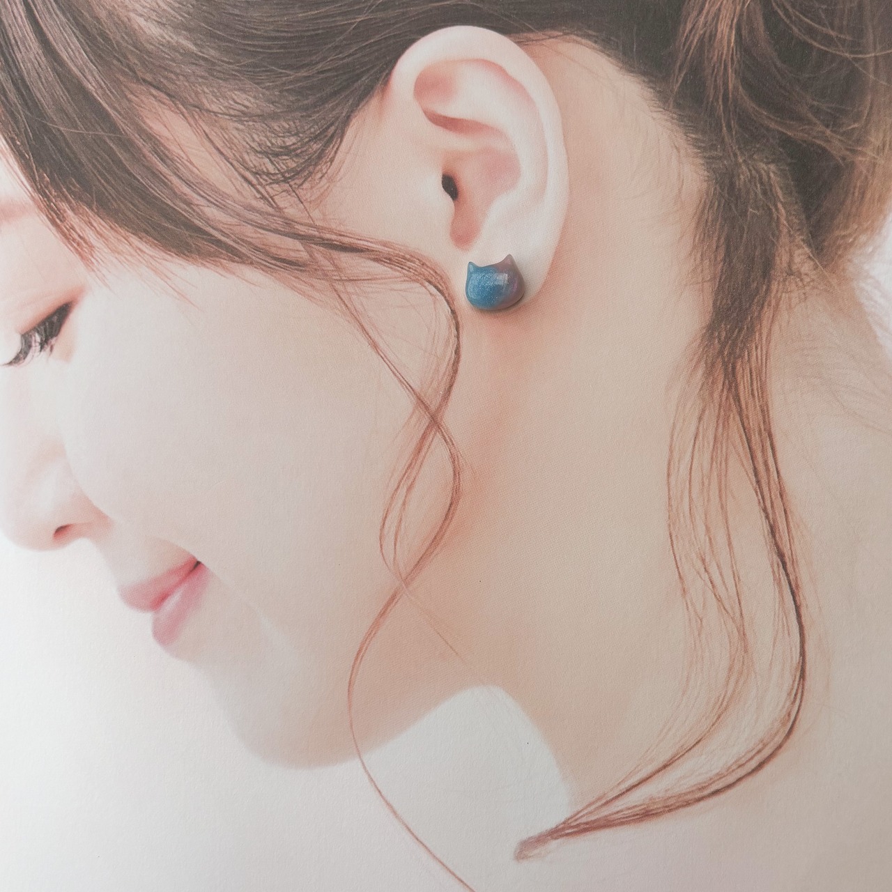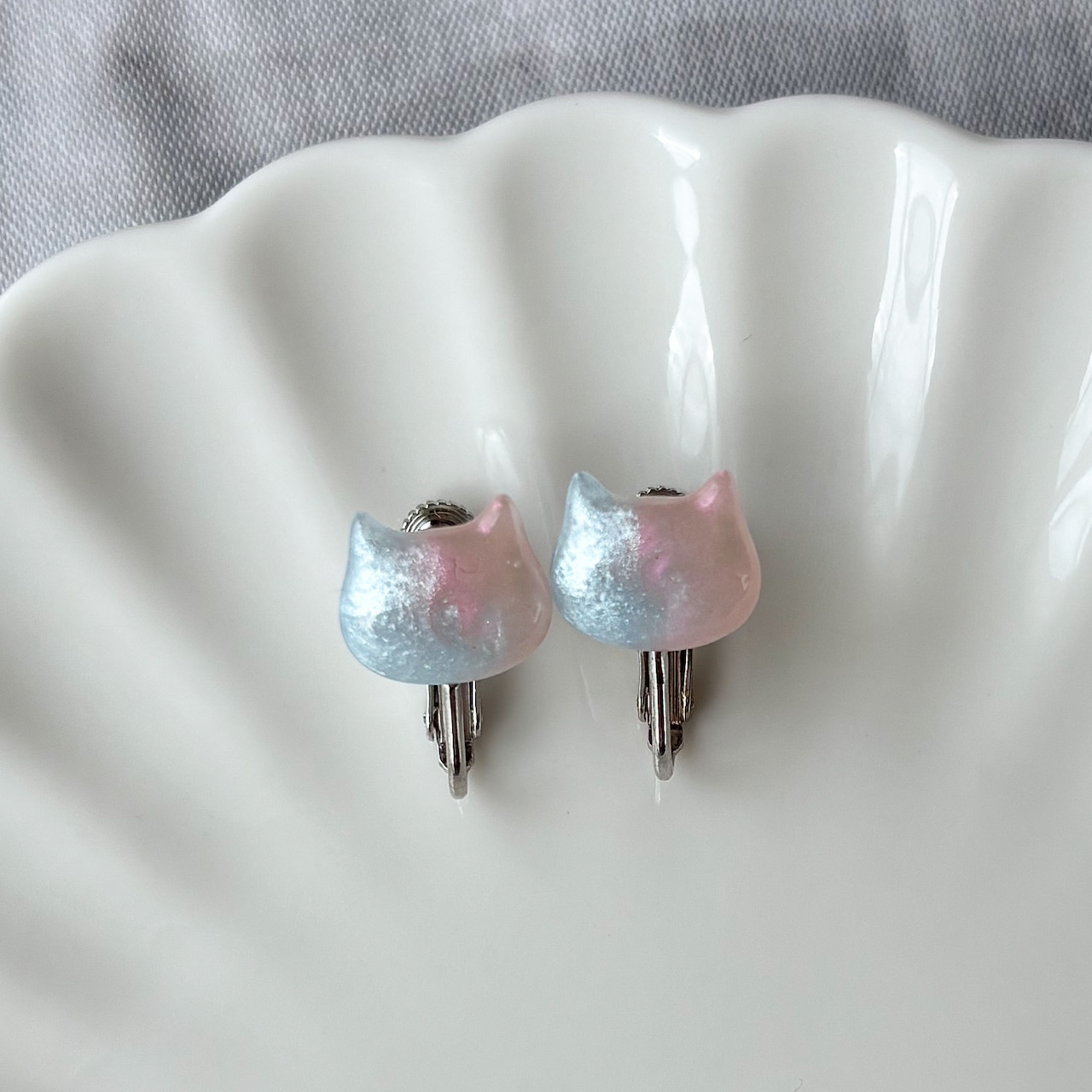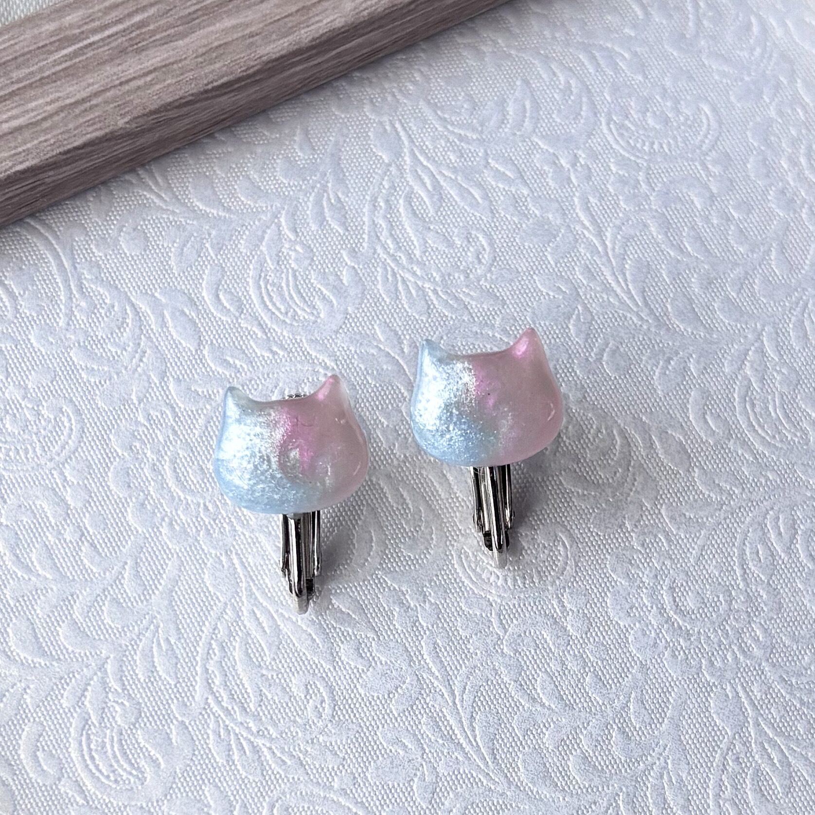 ブルーとピンクのグラデーションがかわいいネコイヤリング。