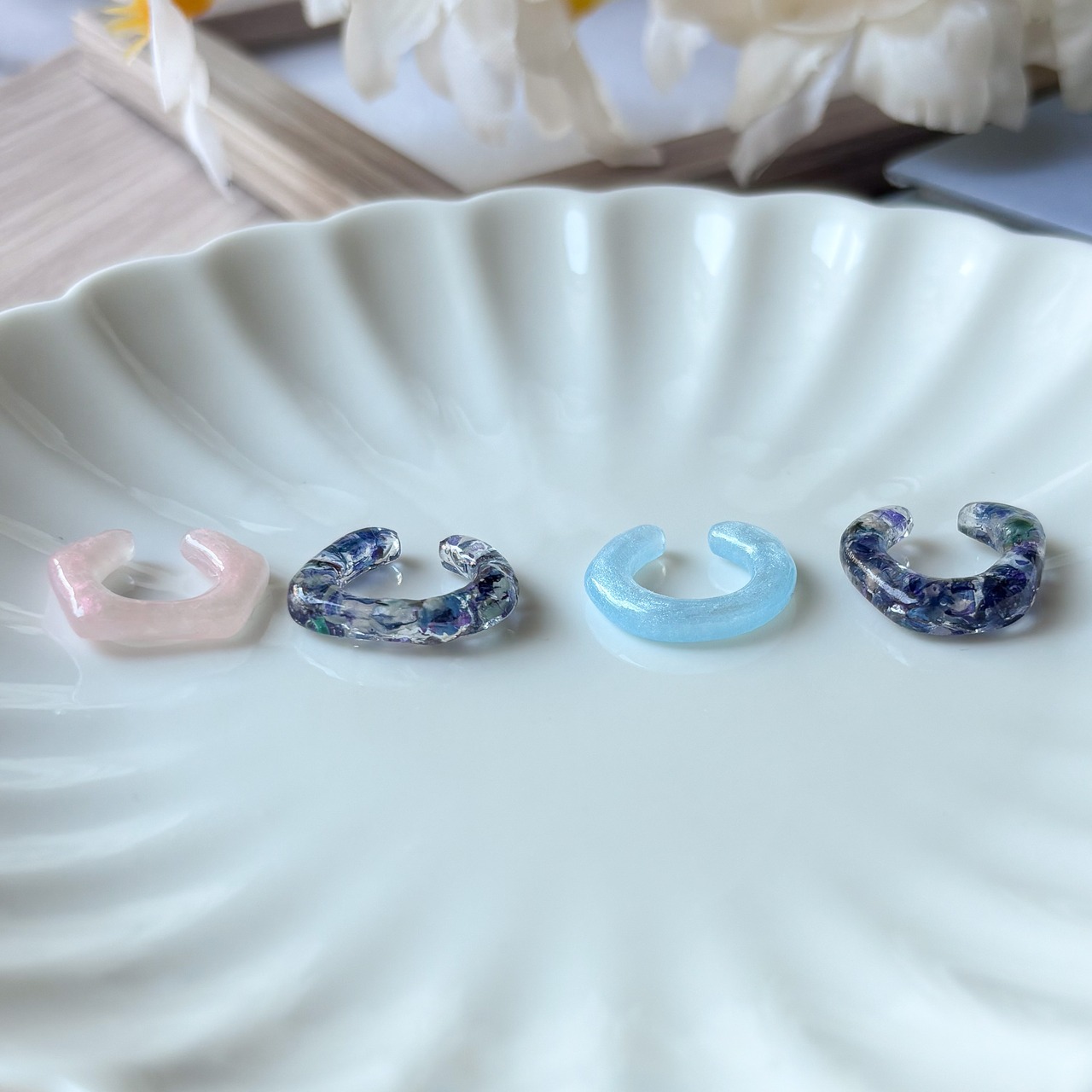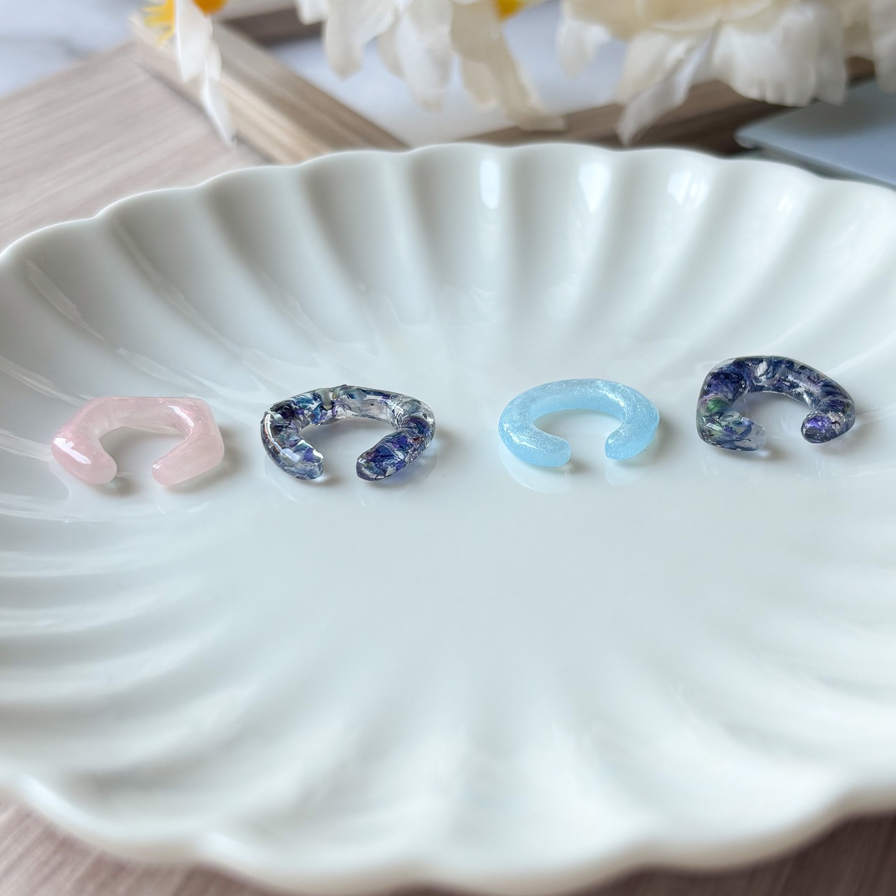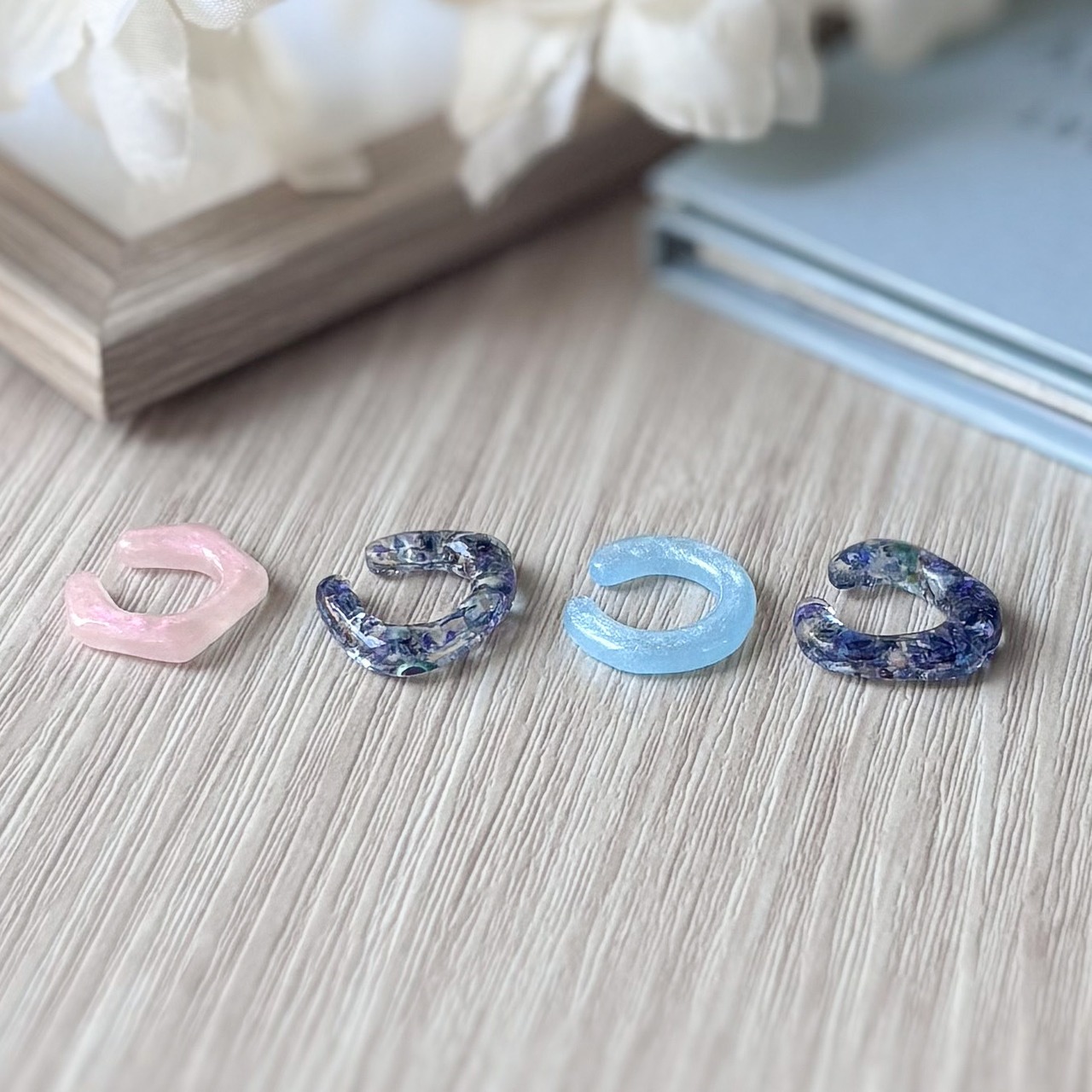 また、レジン作品のでこぼこ、気泡、はみ出しなどがある場合もありますが、ハンドメイドならではのデザインとしてお楽しみいただけると幸いです。