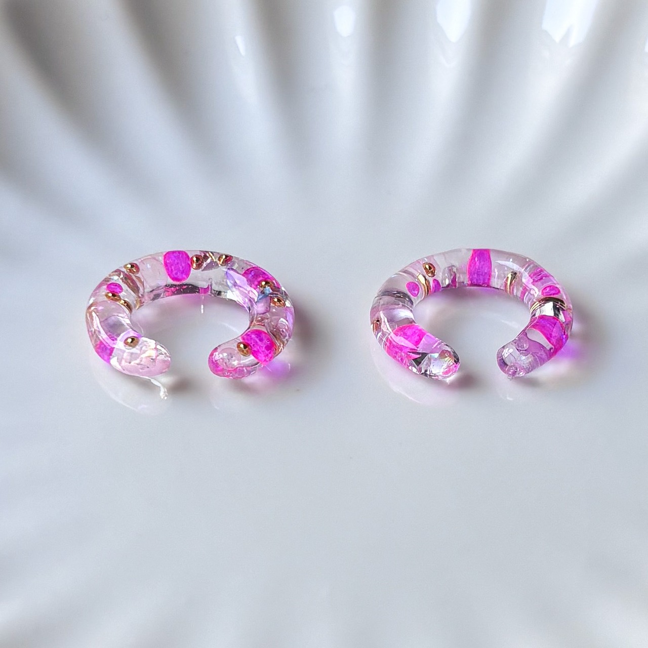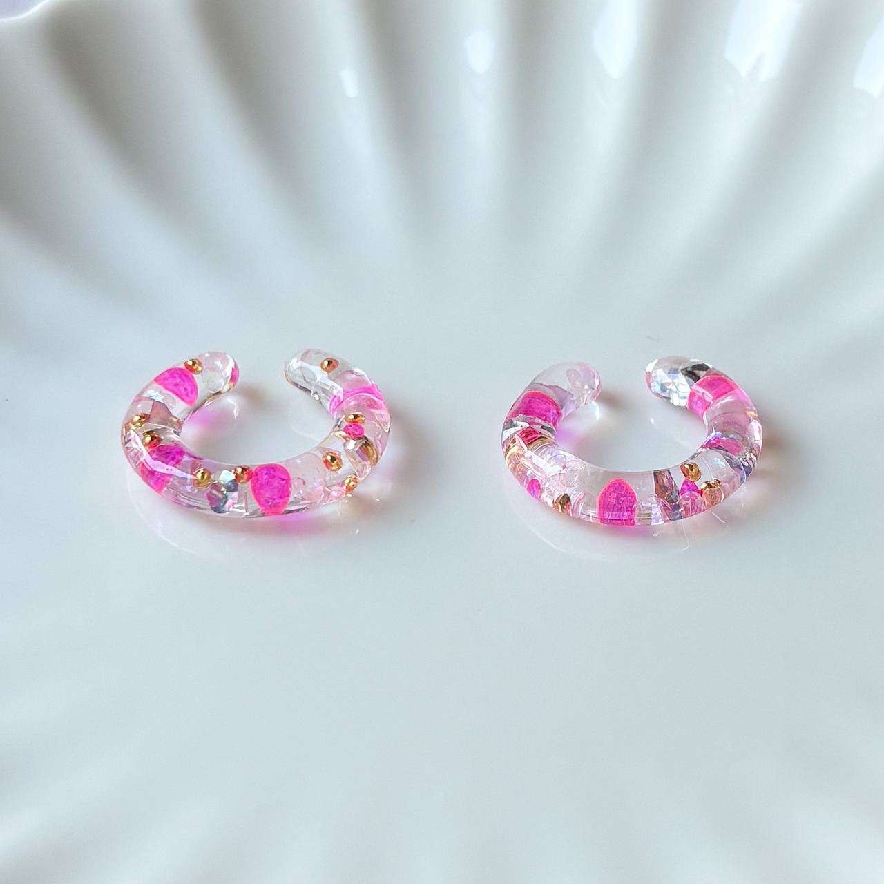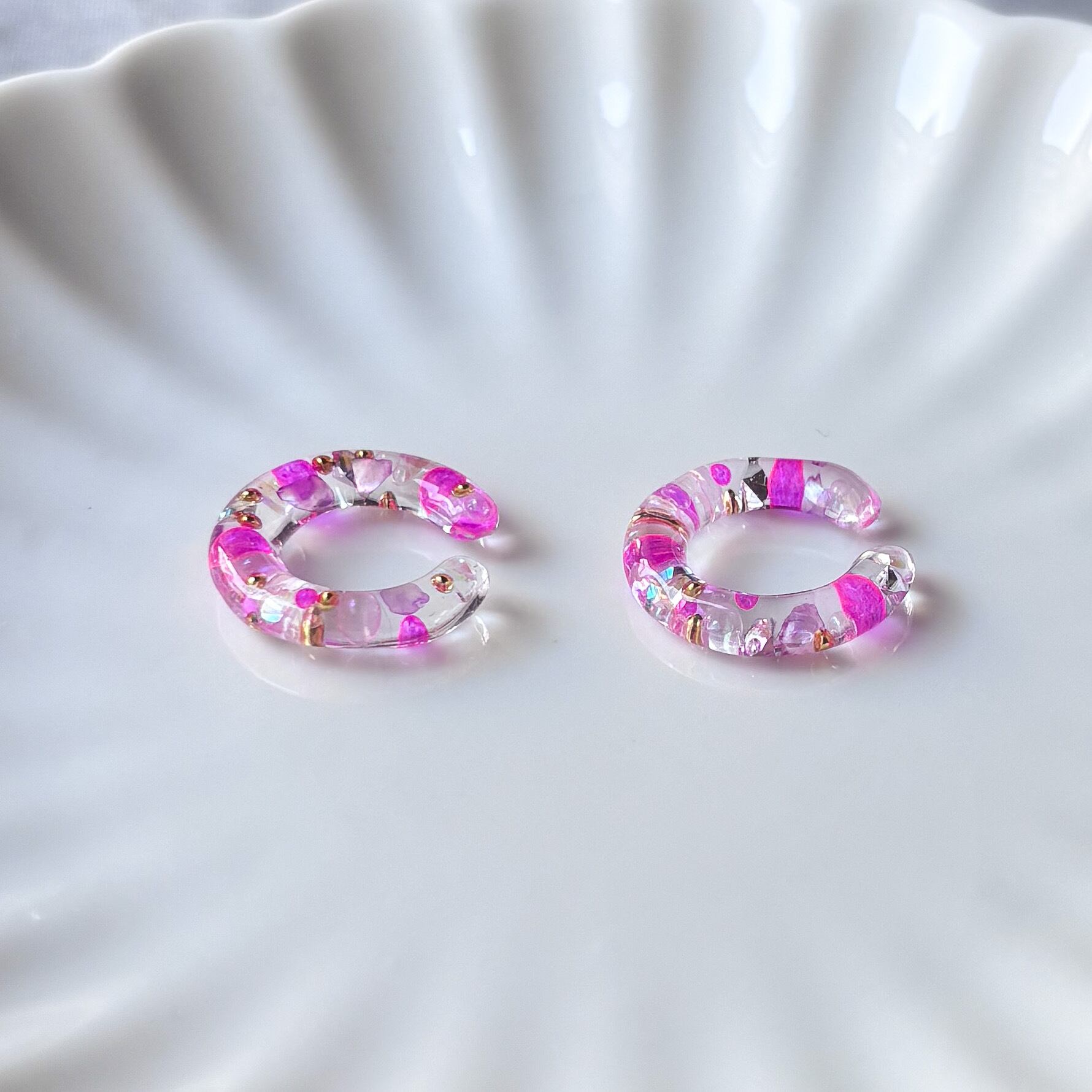また、レジン作品のでこぼこ、気泡、はみ出しなどがある場合もありますが、ハンドメイドならではのデザインとしてお楽しみいただけると幸いです。
