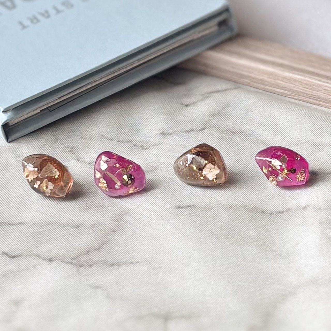 レジン作品のでこぼこ、気泡、はみ出しなどがある場合もありますが、ハンドメイドならではのデザインとしてお楽しみいただけると幸いです。