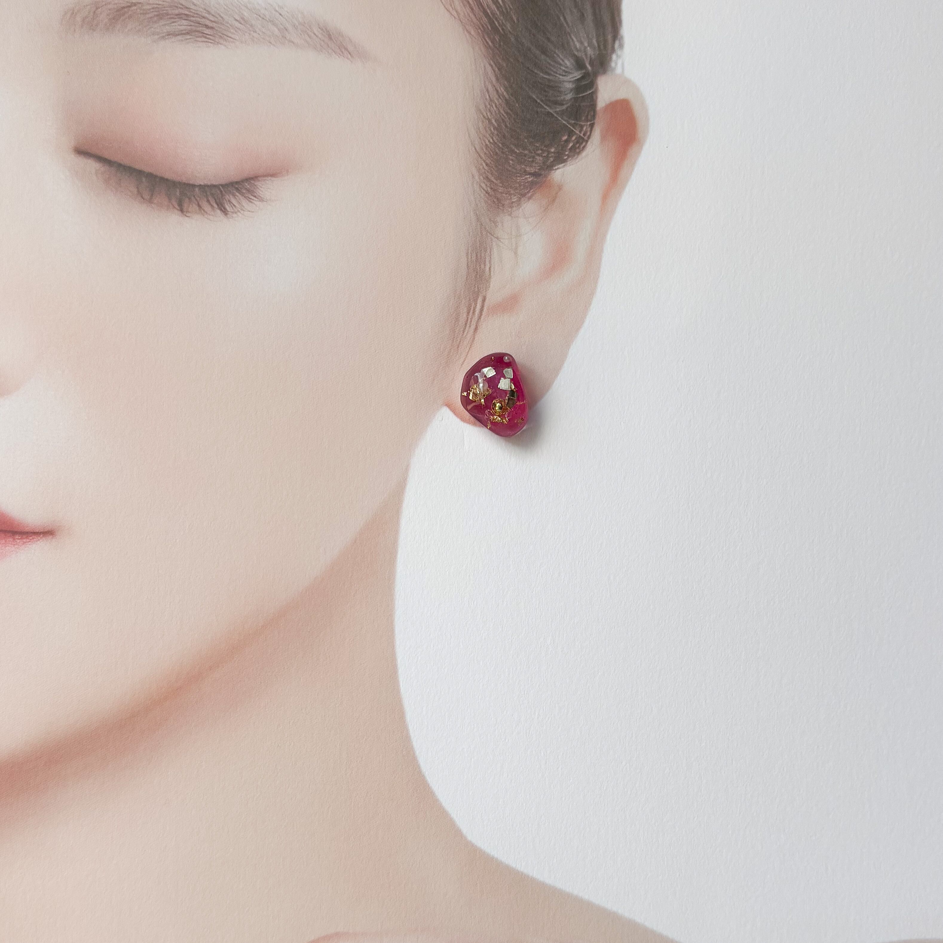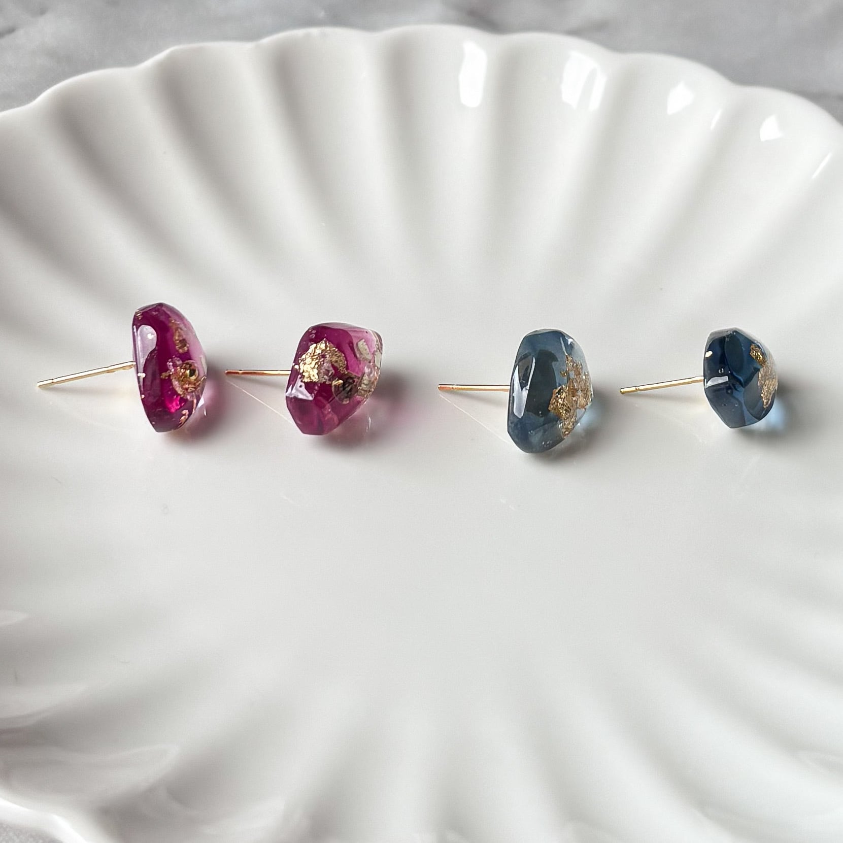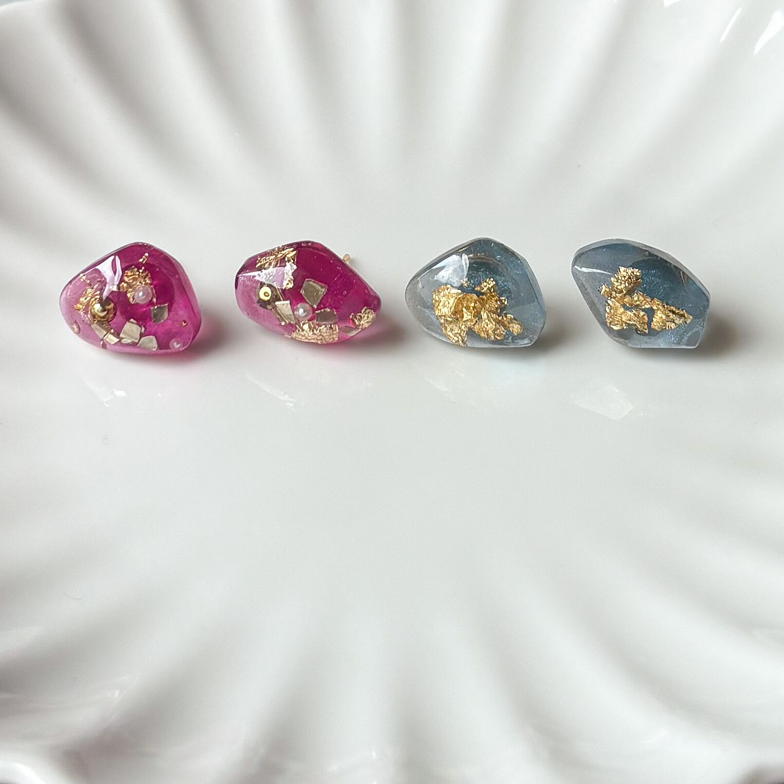 ピンクとブルーに、金箔とゴールドパーツでデザインした、おしゃれピアス。