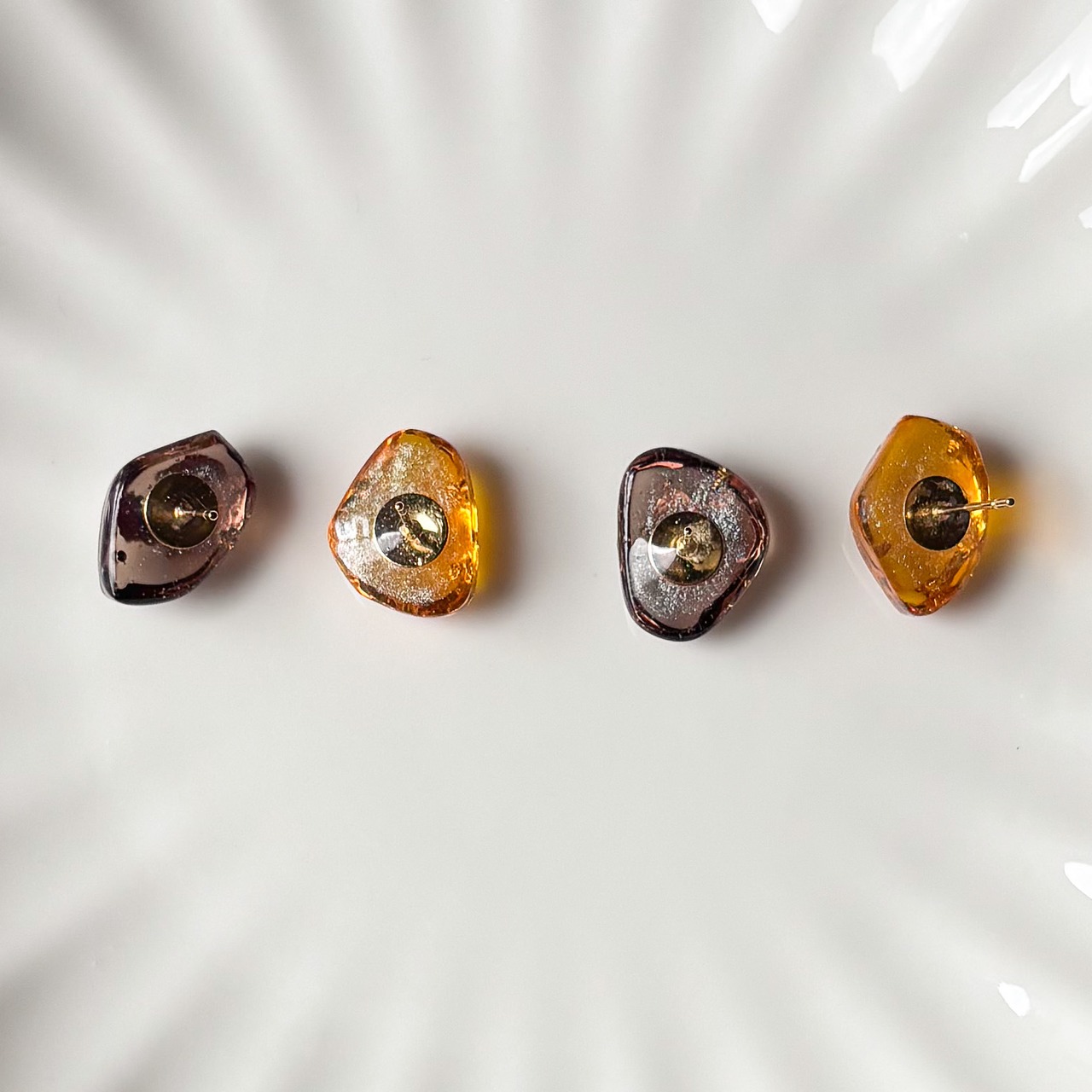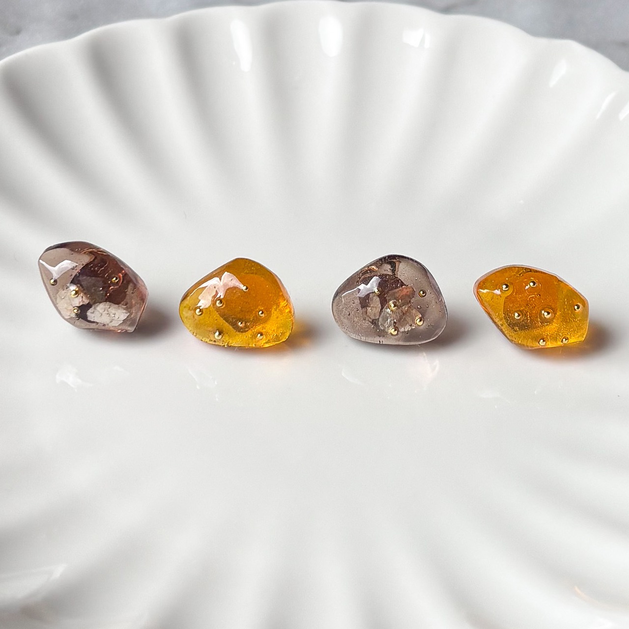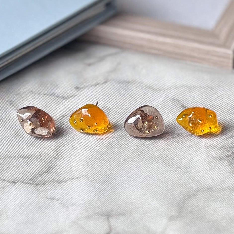 レジン作品のでこぼこ、気泡、はみ出しなどがある場合もありますが、ハンドメイドならではのデザインとしてお楽しみいただけると幸いです。