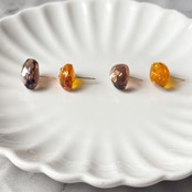 ブラウンとイエローに、シェルやドットのゴールドパーツでデザインした、おしゃれピアス。