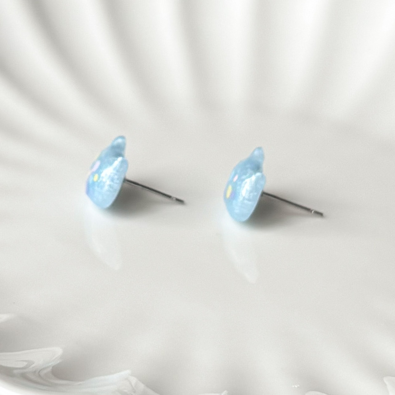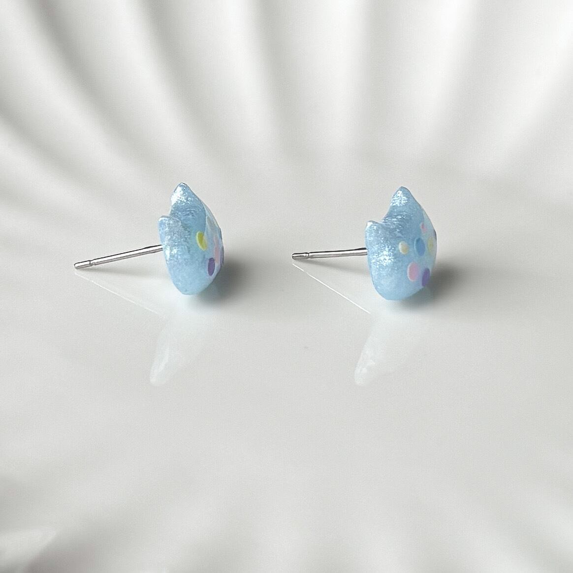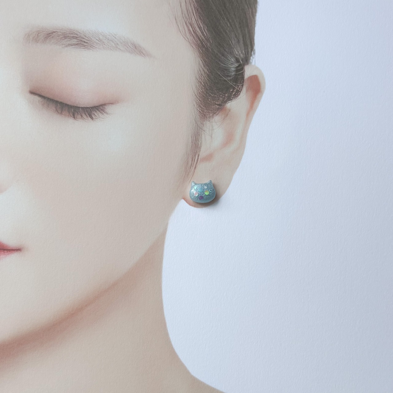 やさしいブルーにカラフルなドットが散りばめられた、遊び心たっぷりのネコモチーフピアス。