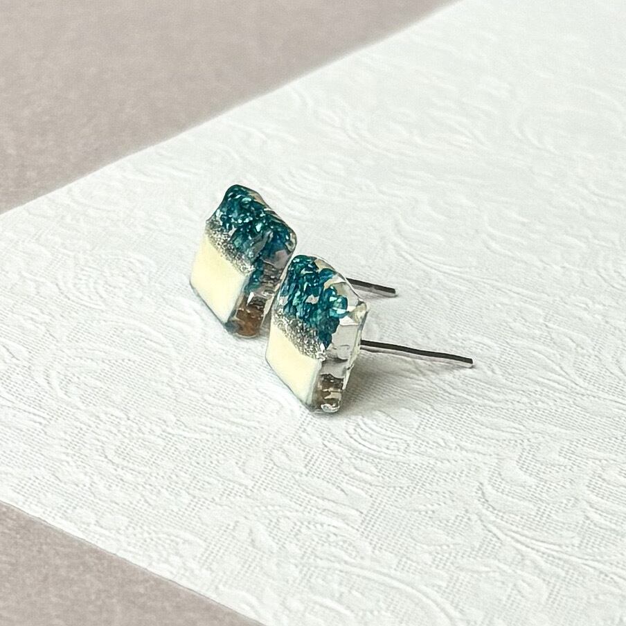 レジンを使った、ブルー、アイボリーとシルバーのピアス。