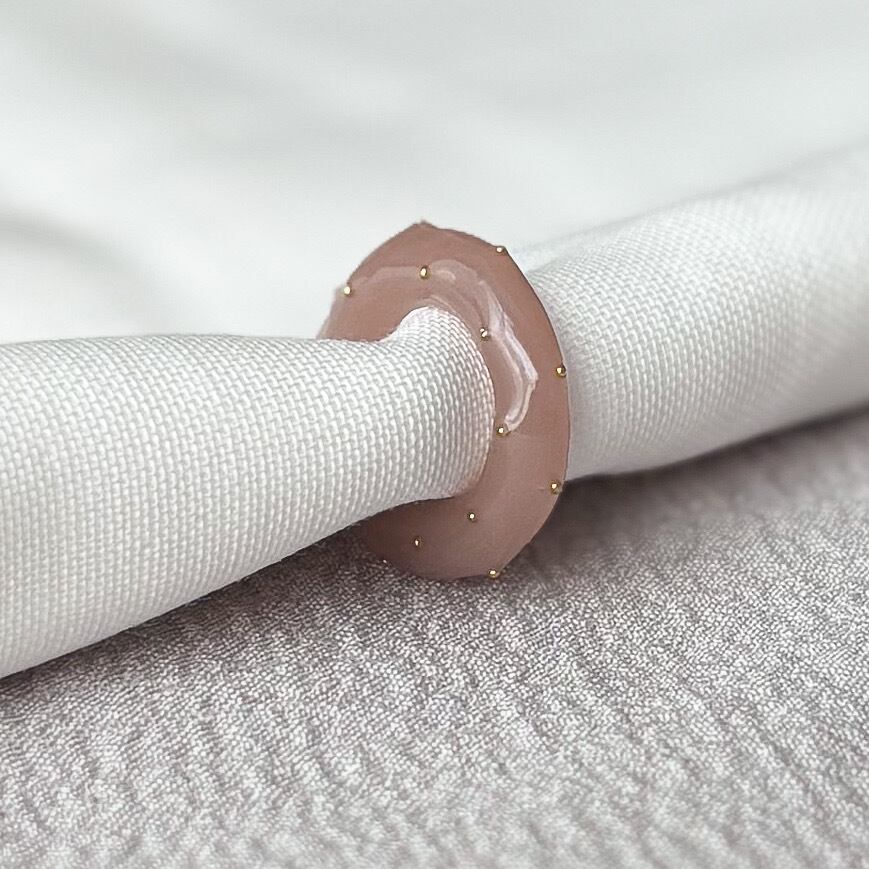 小さなドット模様(水玉デザイン)がさりげなく輝き、ゴールドのアクセントが上品さをプラス。
