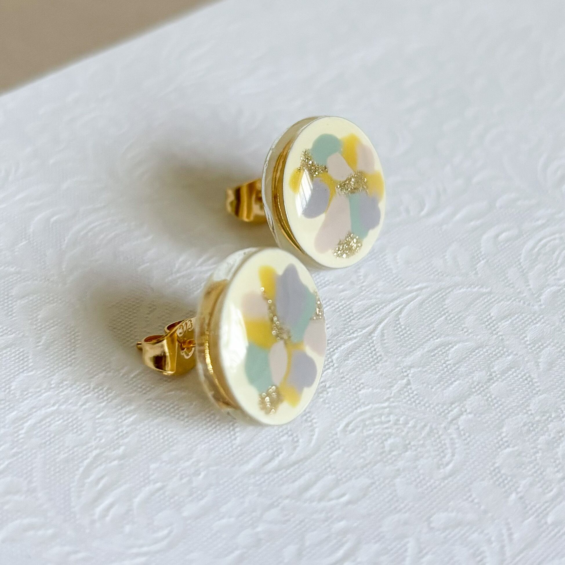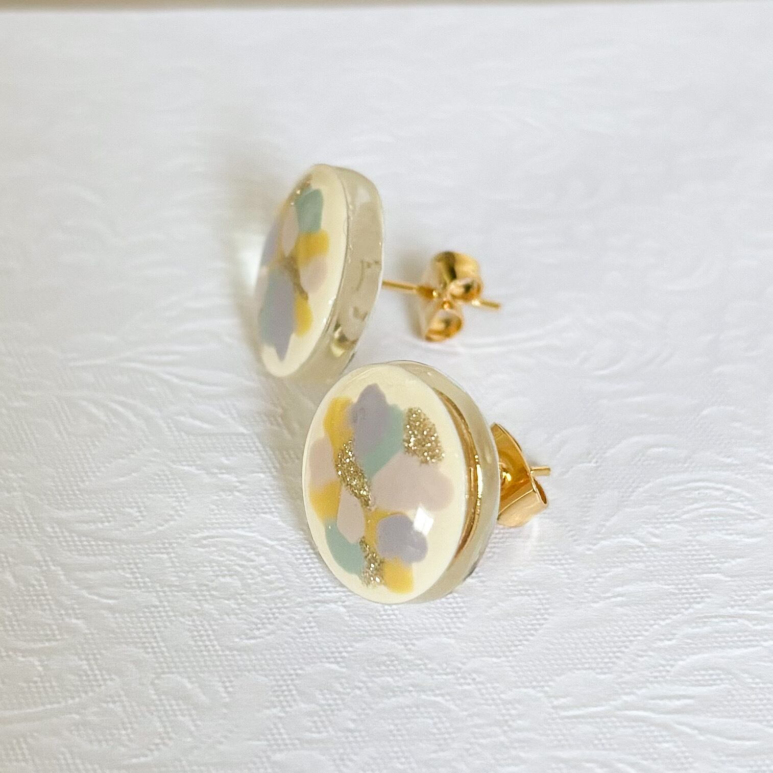 ホワイトをベースに、ベージュやカラフルなランダムドット(水玉)をあしらった、可愛らしくも上品な丸型ピアスです。