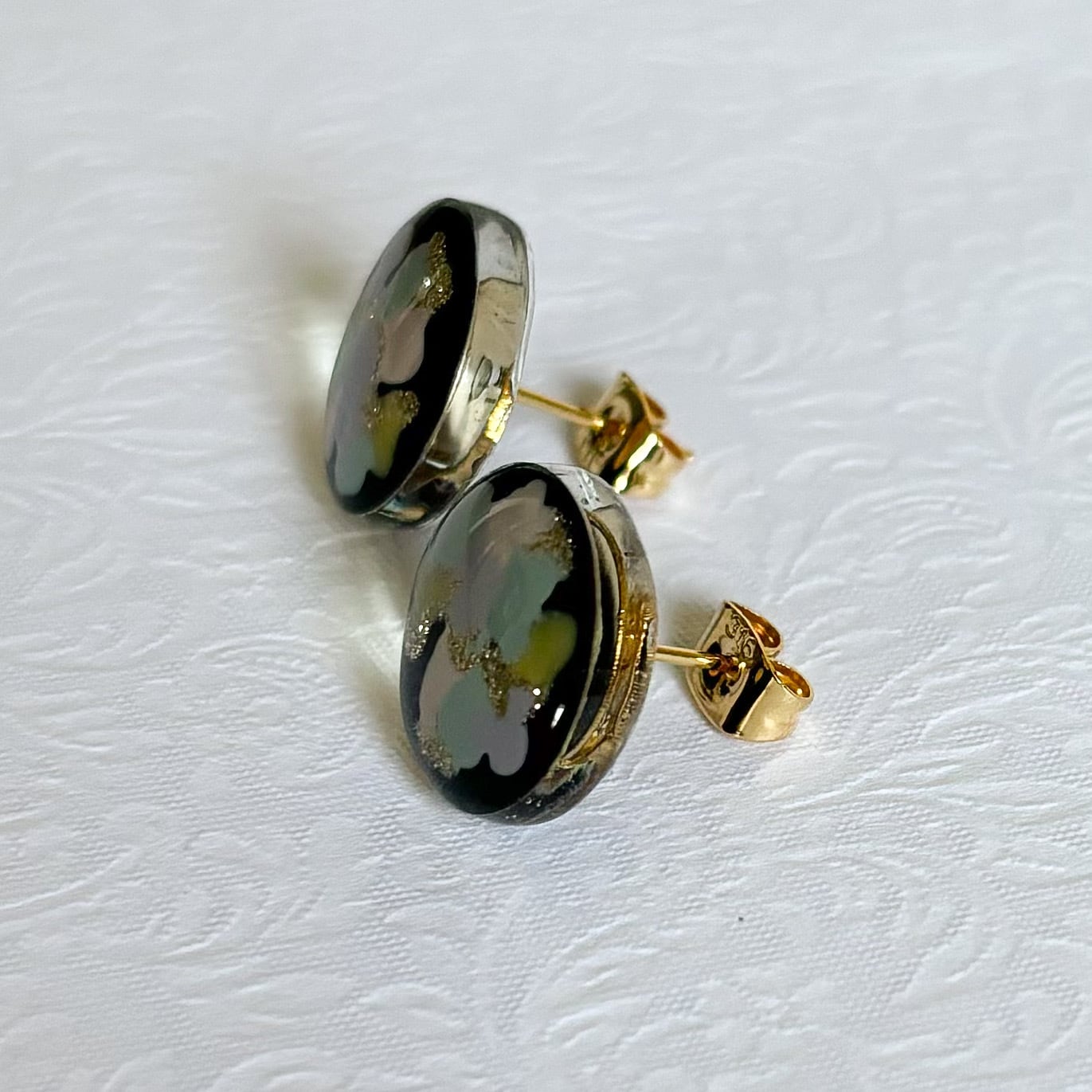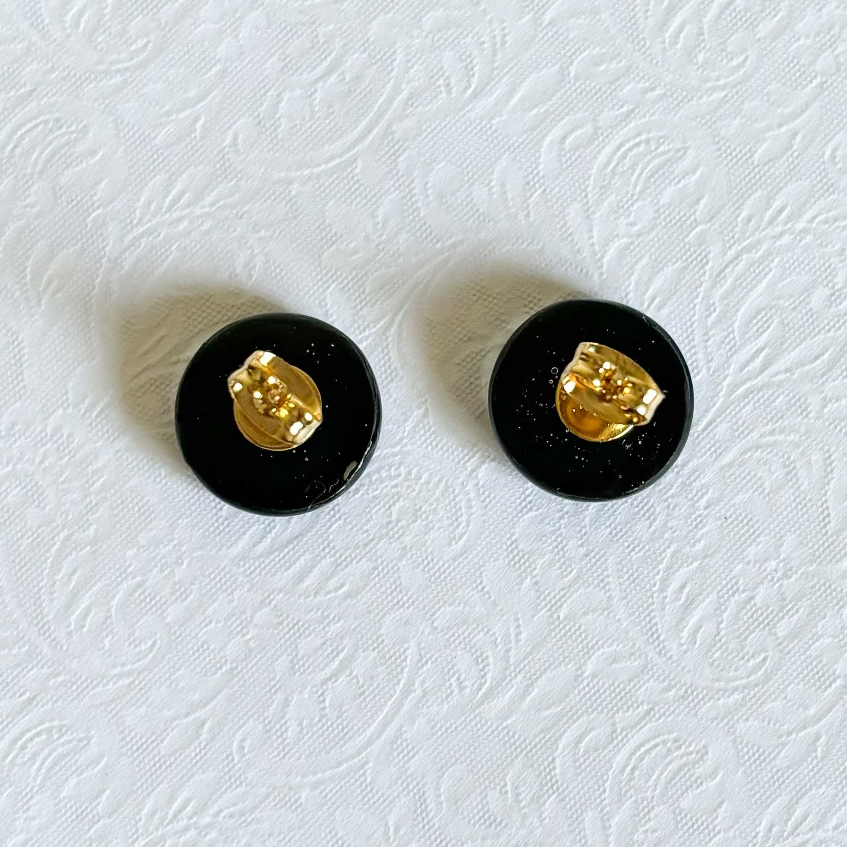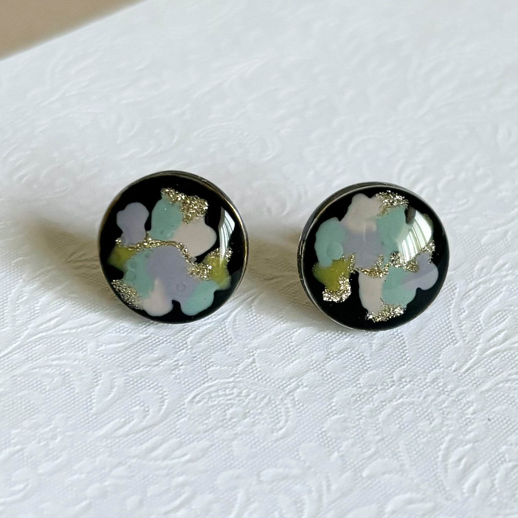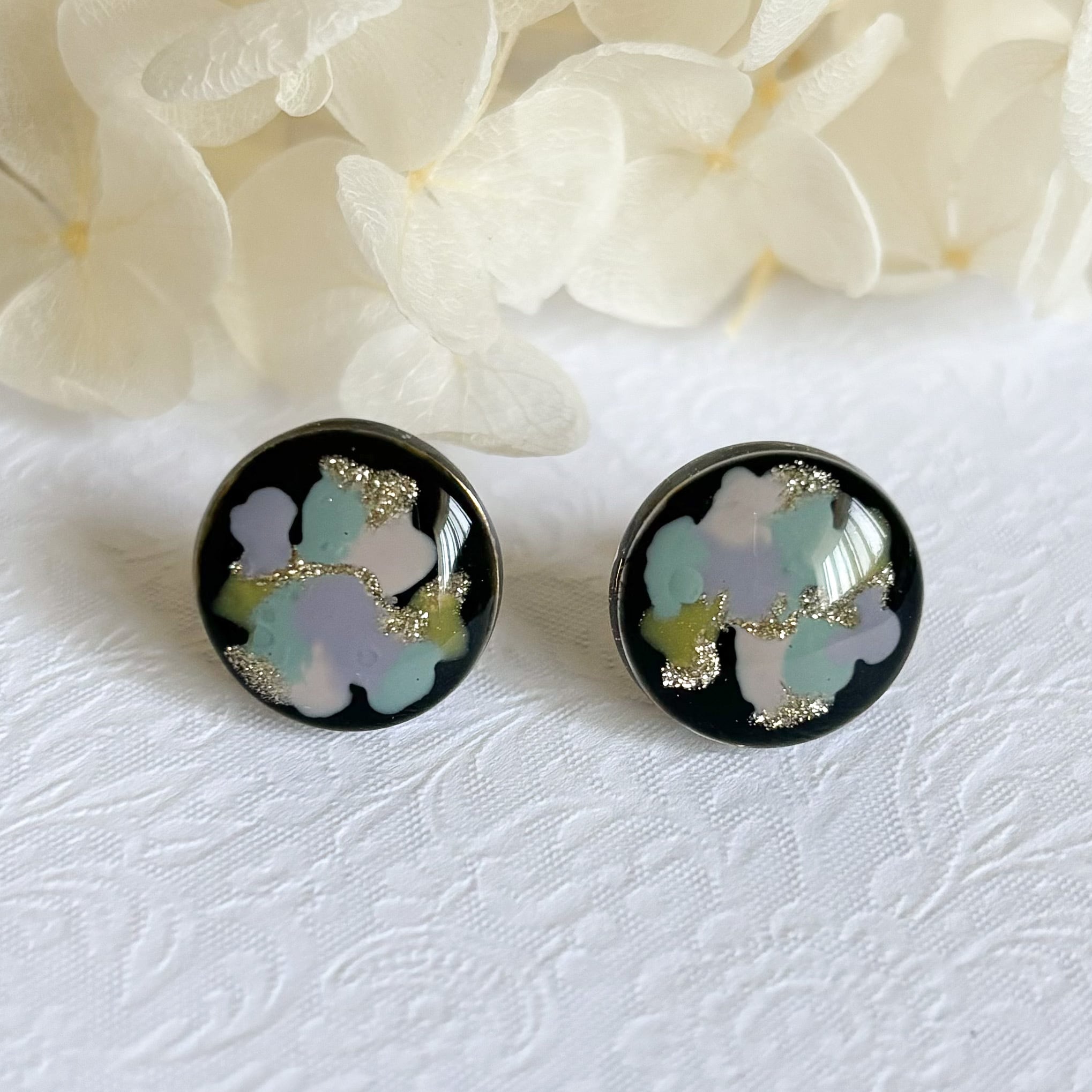 シックなブラックをベースに、ランダムに散りばめたドット柄が目を惹く、遊び心のあるハンドメイドピアスです。