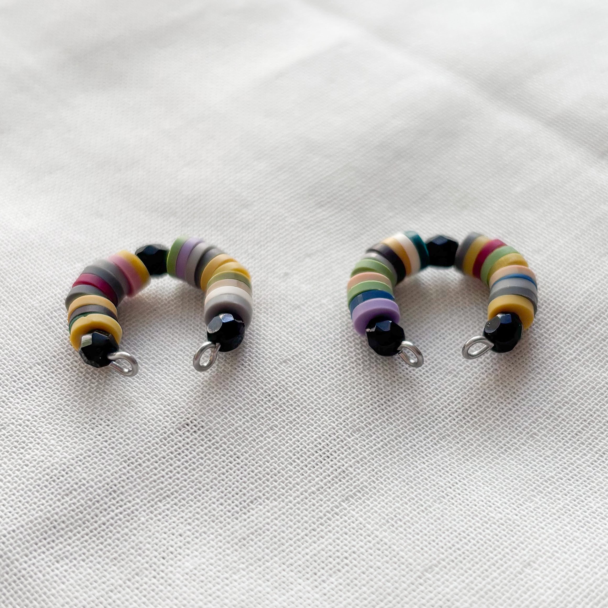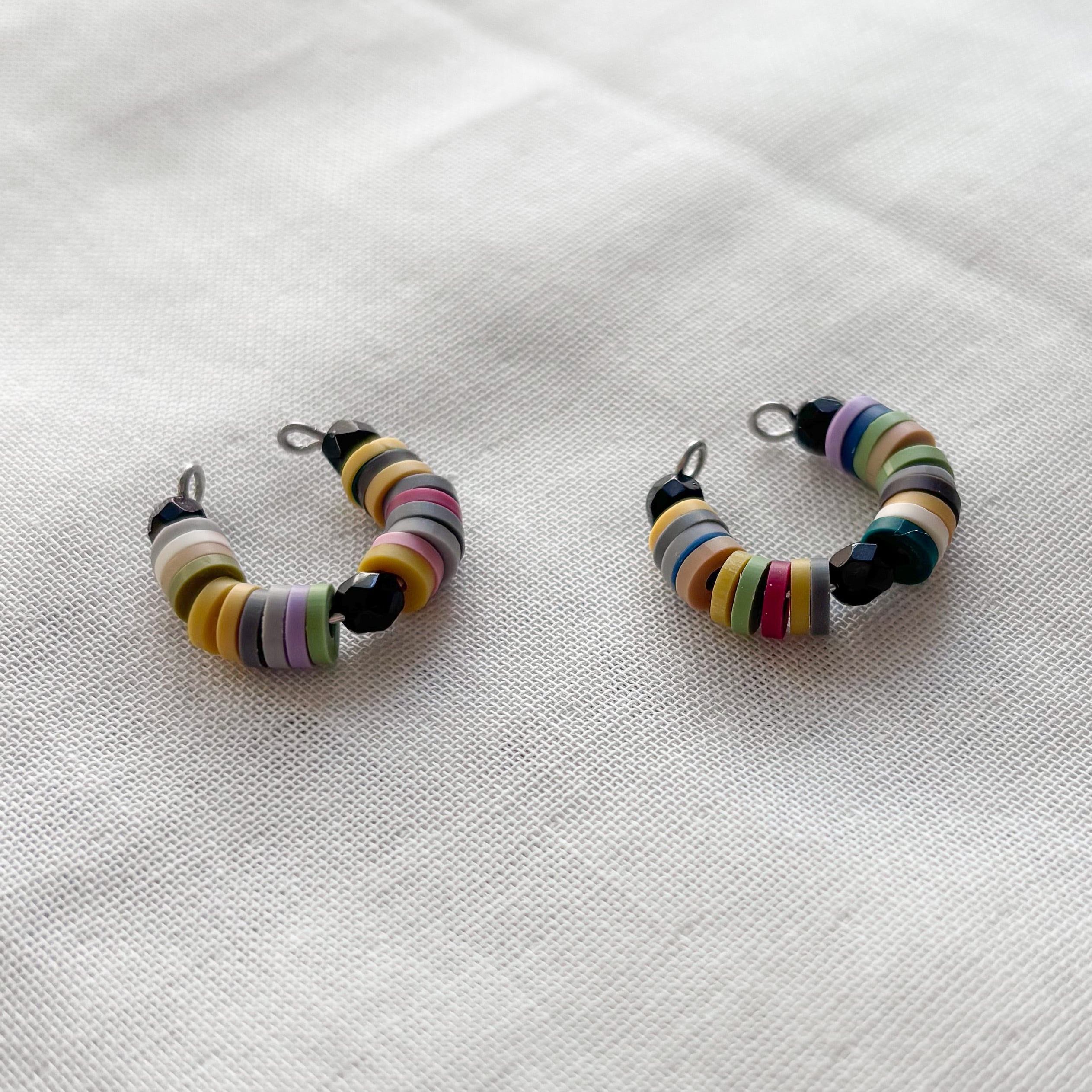 カラフルなクレイビーズに、ブラックビーズをアクセントとして組み合わせた、小さめでかわいいデザインのイヤーカフです。